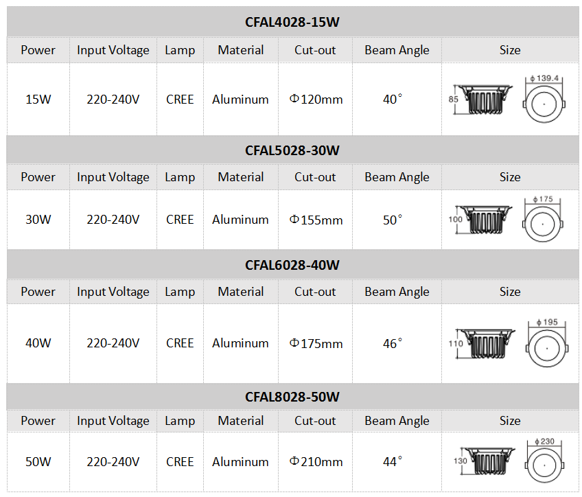 • Each size have circular flat shell,circular inner arc shell and square flat shell.Simple atmosphere,Fine surface electrostatic spray,In the structural design of hte radiator using separate rotary cassette, and between the ring and the heat sink surface a safety line, in order to ensure safe and reliable open face ring subsequent replacement of hte light source modules.